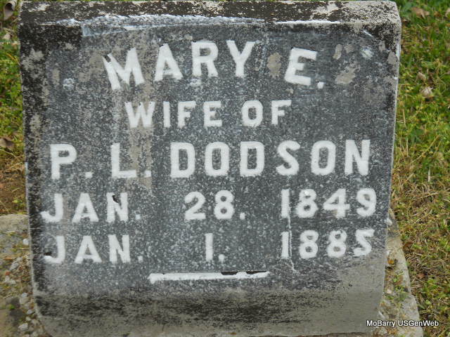 | DODSON, Mary E. | Jan. 28, 1849 | Jan. 1, 1885 | Inscription: "Wife of P. L. Dodson" - Research Note: She was the first wife of Peytan L. Dodson. Grave #388. | Note Stefanie Forester Photo Vicki Kizer |