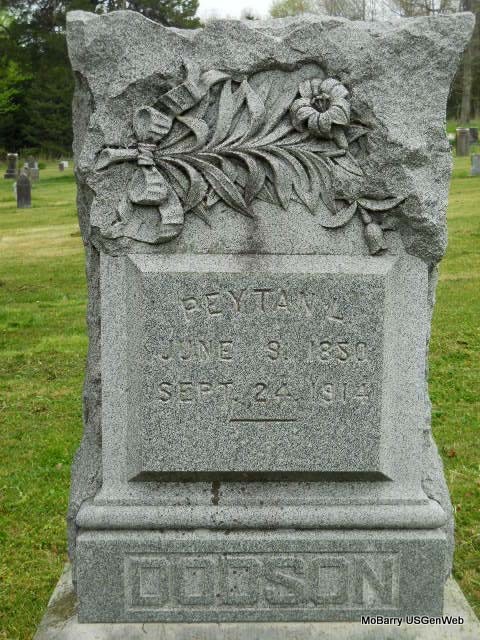 Research Note: Death Cert: "Pate or Peytan L. Dodson" son of Unknown. The cause of death due to blocked bowels. He was married and a farmer. Informant: J. F. Cowell of Madry, MO. Death certificate has birth date June 21, stone has June 9. Pate first married Mary E. ?, second Mary A. Gist on Nov. 25, 1885 in Barry Co., MO, and third Susan Bassett on Dec. 11, 1913 in Barry Co., MO. He was the son of Lazareth and Rebecca Dodson. - January 25, 1912, Thursday, Cassville Republican - Cedar Bluff News: We had a quite wedding in our vicinity last Thursday. The bride was Miss Birdie Oakes, daughter of Mack Oakes. The groom was T. Dodson, son of P. L. Dodson. They are highly respected young people of our community. We wish them a long and happy life. | Death Certificate Stefanie Forester MO Marriage Records Online Newspapers Phyllis Long Photo Vicki Kizer |