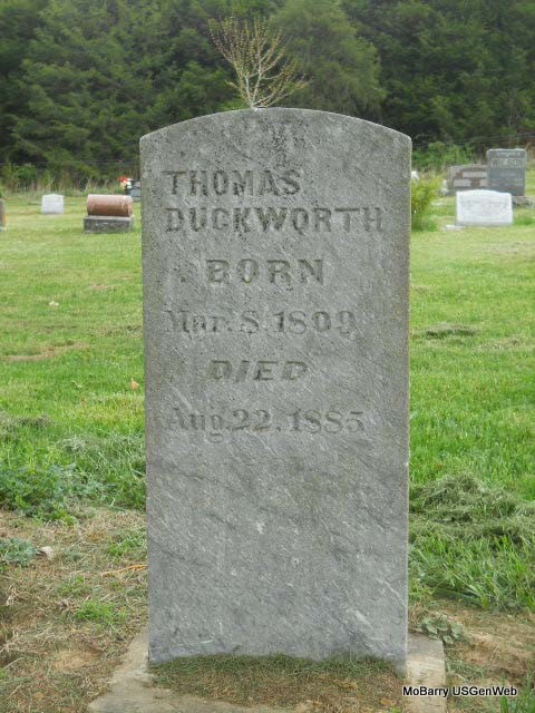Research Note: He was the son of George Duckworth. Thomas Duckworth married Susan (Runyon) (Neill) Lemaster on Jan. 13, 1864 in Barry Co., MO. Susan is buried at Osa Cemetery under Neill. She filed for his Civil War Pension on Nov. 30, 1891 from MO. He served in Co. B, Stone Co., MO H. G. Researchers say his mother was Martha (unknown) and first wife was Martha Perkins. - 1860 Census, Missouri, Stone, Pierce - William A. Triplett age 37, Hoppa age 27, John age 10, Joel, age 4, and Finnette age 1, with Thomas Duckworth age 51 as a boarder. - Susan's Obit - Cassville Republican, December 23, 1897 - Died, Dec. 11, Susan Duckworth, age 78. She was born in McMinn Co., TN, and she married Peter Neil in 1835. They moved to Crane Creek Twp., in Barry Co., in 1850. He died Oct. 15, 1851. They had 8 children. In 1855 she married Dr. Lemaster and had 2 sons Allen and Abraham. He died in 1859. In 1863 she married Thomas Duckworth who died in 1885. She then lived with her youngest daughter who is Mrs. A. M. Willey. Grandma Duckworth has a daughter, Mrs. Enoch Williams, who is 58. Mrs. Williams has a daughter who is Mrs. Tom Bassett who is 40. She has a daughter who is Mrs. Frank Wise who is 18. She has a daughter who is 1 year old. Grave #535. | Online Obits MO Marriage Records Phyllis Long Photo Vicki Kizer |
