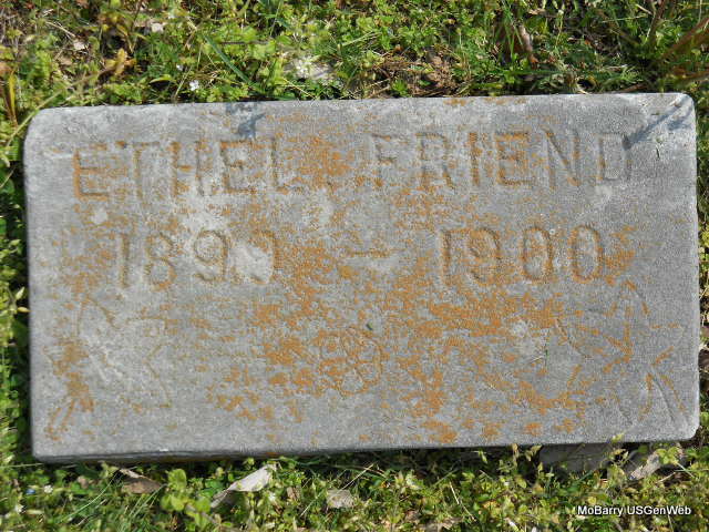 | FRIEND, Infant | 1902 | Oct. 17, 1902 | Inscription: "Inf. Of W. W. and O." - Research Note: Son of William Walter Friend and Oma Mullins, died of congestion of lungs. Grave #375 | Ethel Wells, May 1992 King Funeral Home Jay Trace |