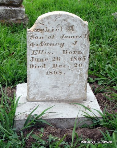 | ELLIS, Ezekiel A. | June 26, 1865 | Dec. 20, 1868 | Inscription: "Son of J. H. and N. J. Ellis" - Research Note: This stone was repaired and reset July 2008. - Judy Wilson's Note: He was a son of James Henry and Nancy Jane (Hilton) Ellis. Grave #165. | Photo Jack Fly Family Knowledge Judy Wilson |