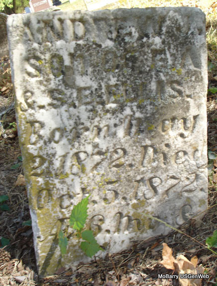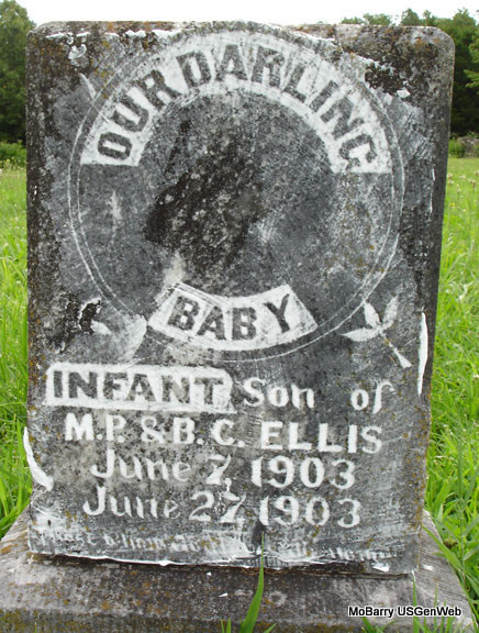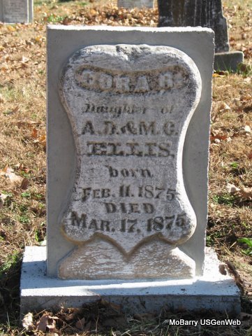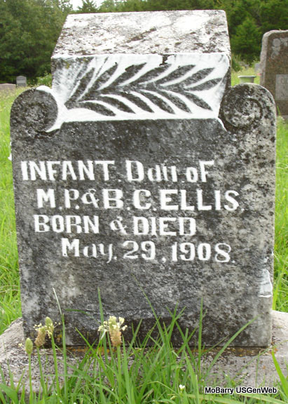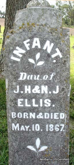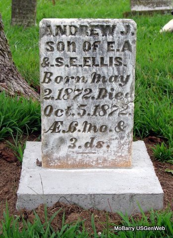 | ELLIS, David C. | 1871 | 1873 | SSW: Edward G. Ellis - Inscription: "Children of G. W. and M. J. Ellis" - Research Note: He was the son of George Washington Ellis and Mary Jane Steel, who were married Jan. 28, 1869 in Barry County, Missouri. Grave #163. | Note Jim L. Wilson Photo Stefanie Forester |