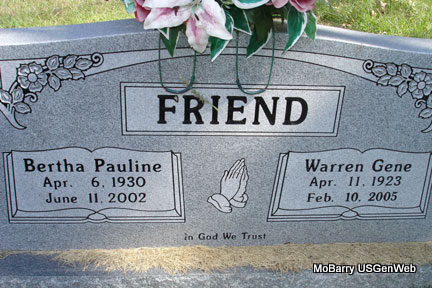 SSW: Bertha Pauline Friend - Inscription: "In God We Trust" - Research Note: Warren Gene was a son of William W. and Oma (Mullins) Friend and nephew of Rev. J. Daniel Friend - The abstract of obit reads: Warren Gene Friend, age 81, of Cassville, died February 10, 2005, at Red Rose Inn in Cassville. He was born April 11, 1923, in Barry County, and was a son of William Walter and Oma (Mullins) Friend. He raised cattle, strawberries and tomatoes. His wife, Bertha Pauline Friend, preceded him in death. He was preceded in death by two sons, Kenny and Charles; two brothers, Allen and Alfred; and three sisters, Grace, Odie, and Alice. | Photo Stefanie Forester Monett Times Feb. 11, 2005 Donna Cooper |