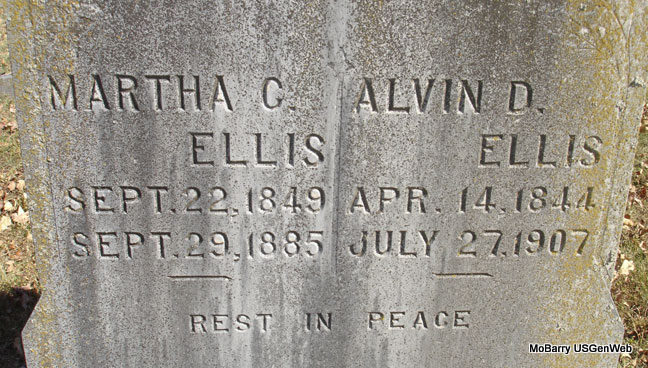 Sept. 29, 1885 | SSW: Alvin D. - Inscription: "Rest in Peace" - Research Note: Wife of Alvin Dowell Ellis. Martha C. Thompson married Alvin D. Ellis on Sept. 7, 1868 in Greene Co., MO. | MO Marriage Records Phyllis Long Photo Stefanie Forester |