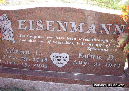 | EISENMANN, Edna D. | Aug. 9, 1944 | No Date | SSW: Glenn L. Eisenmann - Inscription: "Married June 26, 1965" "For by grave you have been saved through faith and that not of yourselves; it is the gift of God. Ephesians 2:8." | Photo Stefanie Forester |