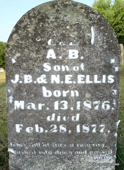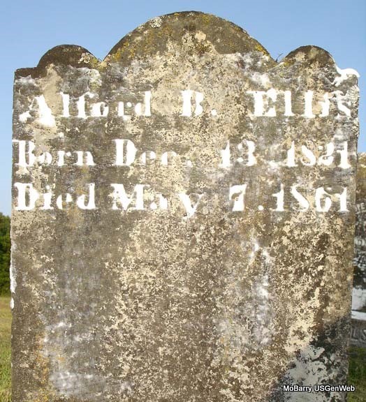 | ELLIS, Alfred B. | May 13, 1876 | Feb. 28, 1877 | Inscription: "Son of J. B. and N. E. Ellis. Whose all of life, a rosy ray, Blushed into dawn, and passed away." - Research Note: Son of Jeremiah B. Ellis and Nancy Elizabeth Wilson. Grave #146. | Note Phyllis Long Photo Stefanie Forester |