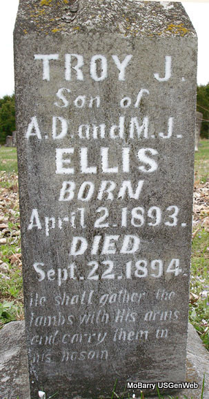 | ELLIS, Troy J. | Apr. 2, 1893 | Sept. 22, 1894 | Inscription: "Son of A .D. and M. J." , "He shall gather the lambs with his arms and carry them in his bosom." - Research Note: Son of Alvin D. Ellis and Martha J. (Lee) Pharris. Grave #433. | Note Phyllis Long Photo Stefanie Forester |
