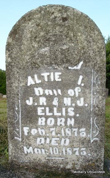 | ELLIS, Altie I. | Feb. 7, 1875 | Mar. 10, 1875 | Inscription: "Dau. of J. R. and N. J. Ellis" - Research Note: Researchers say she was the daughter of James Henry Ellis and Nancy Jane Hilton. Stone definitely says J. R. | Note Phyllis Long Photo Stefanie Forester |
