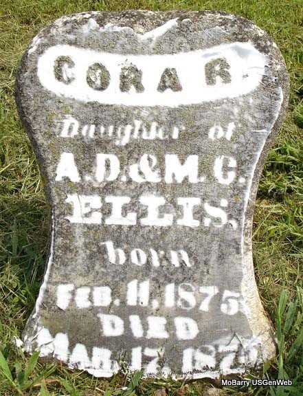| ELLIS, Cora R. | Feb. 11, 1875 | Mar. 17, 1875 | Inscription: "Dau. of A. D. and M. C. Ellis" - Research Note: Daughter of Alvin D. and Martha C. (Thompson) Ellis. Stone was repaired and reset October 2008. Grave #434. - Before restoration. | Note Phyllis Long Photo Stefanie Forester |