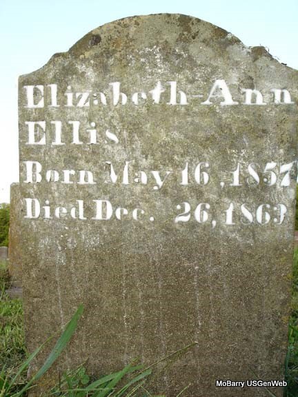 | ELLIS, Elizabeth Ann | May 16, 1857 | Dec. 26, 1863 | Research Note: - Judy's Note: She was a daughter of Alford B. and Matilda Malinda (Lawson) Ellis. Grave #165. | Photo Ethel Wells, May 1992 Family knowledge Judy Wilson |