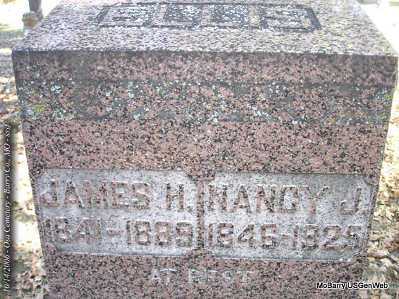 SSW: Nancy J. Ellis - Inscription: "At Rest" - Research Note: James was a son of Alford B. Ellis and Matilda M. Lawson. - James H. Ellis was born in McMinn County, Tenn., in 1841, and is a son of Alfred and Matilda (Lanson) Ellis, also Tennesseeans, where they grew to maturity and married. They came to Greene County, Mo., in 1853, and to Barry County in 1856, and finally settled in Stone County, where the father improved a large farm. He was a soldier in the Mexican War, and died in May, 1861. Of his eleven children, the following are living: James, John, Ezekiel, Jeremiah, George, William and Margaret. The mother has been three times married since the death of her first husband, and is living with her fourth husband, Calvin Carney, in Barry County. James H. Ellis has always lived in Barry and Stone Counties, Mo. He enlisted in the Enrolled Militia in 1862, and in 1863 joined the Missouri Cavalry, United States Army, and was discharged in June, 1865, at Springfield. After his return he resided in Barry County about four years, then came to his present location in Stone County, where he has a fine farm of 110 acres, with 100 under cultivation. His union with Nancy J. Hilton, which occurred in 1862, resulted in the birth of thirteen children, ten now living: John W., married and living in Stone County; Sarah E., Isaac, Alfred, Albert, Nettie, Matilda, Eliza J., Elvin, and an infant son not named. Those deceased are as follows: one who died in infancy, Ezekiel, and Mary A., who died at the age of thirteen years. Mr. Ellis and wife are members of the Christian Church. - Grave #430. | Goodspeed's 1888 History Phyllis Long Photo Note Stefanie Forester |