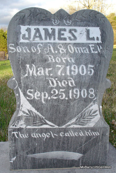 | ELLIS, James L. | Mar. 7, 1905 | Sept. 25, 1908 | Inscription: "Son of A. and Oma Ellis" - "The angel called him" - Research Note: Son of Alfred L. Ellis and Oma K. Scott. Grave #474. | Note Phyllis Long Photo Stefanie Forester |