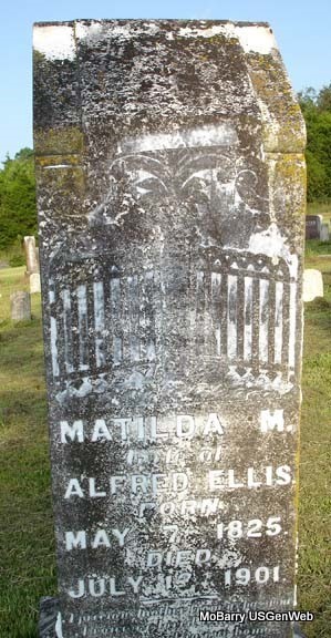 | ELLIS, Matilda Malinda (LAWSON) (SHORT) (CULTON) (CARNEY) | May 7, 1825 | July 13, 1901 | Inscription: "Wife of Alfred Ellis. A precious mother from us has gone, A voice we loved is stilled, A place is vacant in our home, Which never can be filled." - Research Note: Matilda Malinda Lawson was the daughter Richard Lawson and Mary Campbell (see Mary Lawson's grave stone, Osa Cemetery). She married Alford B. Ellis (see his gravestone in Osa Cemetery) on Mar. 25, 1840 in McMinn County, TN. They migrated to Missouri between 1850 and 1860 and were the parents of 8 children of record. After Alford's death, Matilda married John G. Short on Nov. 12, 1863 in Stone Co, MO. She had one son with him. After the death of John Short she married James W. Culton, about 1865, who was previously married with children, and they were the parents of one child (see gravestone, Osa Cemetery). After James Culton's death Matilda married Calvin Carney on June 4, 1885 in Stone Co, MO. She resided in Pierce Township, Stone Co, MO, from 1860-1900 according to census records. - Grave #133. | Photo Stefanie Forester Census MO Marriage Records Jim L. Wilson |