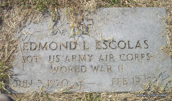 Inscription: "Sgt. US Army Air Corps World War II" - Research Note: He was the son of Eugene C. and Angele' Escolas; he was a retired Professor of finance at the University of Wyoming. Edmond L. Escolas - University of Wyoming B.A. 1943, Assumption College; M.A. 1947, Clark University; Ph.D. 1960, Clark University, Huebner Postdoctoral Fellow 1970-71. - Military Stone | Crafton-Cantrell Funeral Home Connie Schmidt Note Phyllis Long Photo Stefanie Forester |