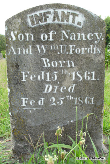 | FORBIS, Infant | Feb. 15, 1861 | Feb 25, 1861 | Inscription: "Son of Nancy and Wm. U." - Research Note: On the stone the surname is spelled Fordis, with a d, it should be Forbis, with a b. | Note Ethel Wells, May 1992 Photo Stefanie Forester |