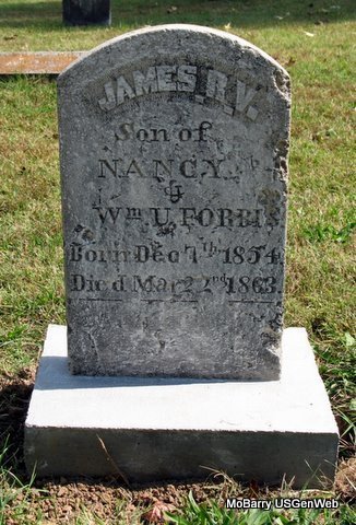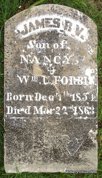 | FORBIS, James R. V. | Dec. 7, 1854 | Mar. 2, 1863 | Inscription: "Son of Nancy and Wm. U. Forbis" - Research Note: This stone was repaired and reset July 2008 by Jack Fly. Research Note: Grave #111. - Before Repair | Photo Jack Fly Photo Stefanie Forester |
