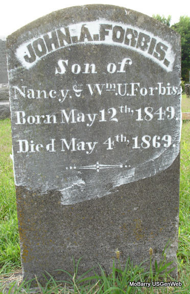 | FORBIS, John Asberry | May 12, 1849 | May 4, 1869 | Inscription: "Son of Nancy and Wm. U. Forbis" - Research Note: Son of William Urban Forbis and Nancy Alley. Grave #112. | Photo Note Stefanie Forester |