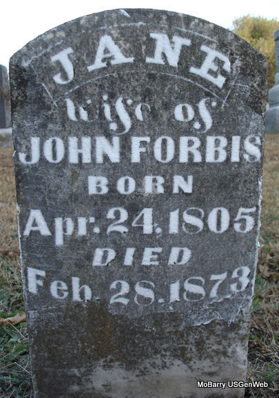 | FORBIS, Jane (HAYES) | Apr. 24, 1805 | Feb. 28, 1873 | Inscription: "Wife of John Forbis" - Research Note: Second wife of John F. Forbes. Grave #115. | Census Phyllis Long Photo Stefanie Forester |