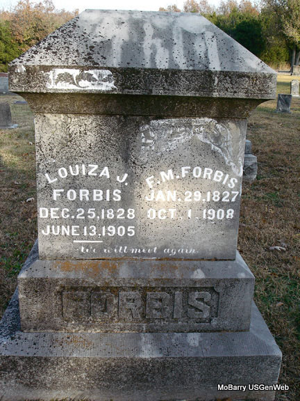 | FORBIS, Louiza J. | Dec. 25, 1828 | June 13, 1905 | SSW: Finley M. Forbis - Inscription: "We will meet again." - Another Photo - Research Note: Grave #117. | Photo Stefanie Forester Photo Vicki Kizer |