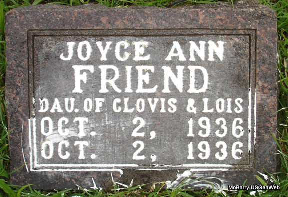 | FRIEND, Joyce Ann | Oct. 2, 1936 | Oct. 2, 1936 | Inscription: "Dau. of Clovis and Lois" - Research Note: Infant stillborn daughter of Clovis Friend born in Stone Co., MO, and Lois Short, born in Barry Co., MO. Grave #153. | Death Certificate Phyllis Long Photo Stefanie Forester |