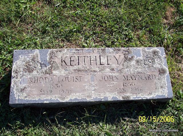 SSW: Rhoda Louise Keithley - Research Note: Rhoda Louise Jenkins and John Maynard Keithley were the parents of Newton Arthur Keithley who married Susan McCallister. - John was widowed and the son of James A. Keithley born TN and Susannah Hodges born IN. Mitte Keithley of Carterville, MO was the informant on the death certificate. It gives his birth date as Apr. 28, 1849. Census says he was born in MO, DC gives IA. Grave #327. | Photo Diana Cope Note Stefanie Forester Death Certificate Phyllis Long |