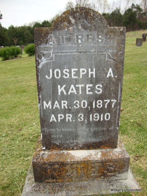 Research Note: Died of pulmylitis at age 33 years, 4 days. Son of John Kates and Jane Unknown (His mother was Sarah Jane (Richardson) (Kates) Boyer). The cause of death was anterior poliomyelitis in Aurora, Lawrence Co., MO. He was married and a farmer. Informant: A. H. Madry of Aurora, MO. Joseph A. Kates, age 21, married Bessie Mae McCallister, age 18, on Mar. 7, 1899 in Barry Co., MO. Bessie Kates, age 32, second married James B. Collier, age 48, on May 18, 1913 in Aurora, Lawrence Co., MO. She third married Joseph E. Lee and is buried at Maple Park Cemetery, Aurora, Lawrence Co., MO buried with her daughter Lorraine C. (Collier) Huddleston. - Grave #397. | King Funeral Home Jay Trace MO Marriage Records Census Phyllis Long Death Certificate Stefanie Forester Photo Connie Schmidt |
