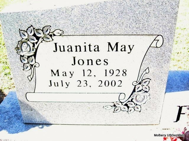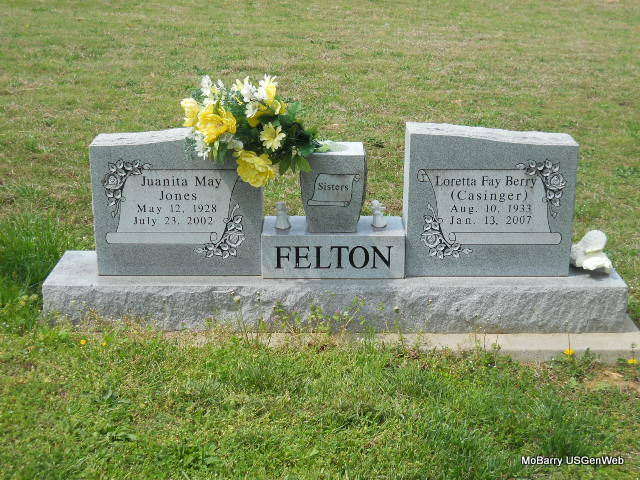 SSW: Loretta Fay Berry - Inscription: "Sisters" - Research Note: Juanita May Jones, age 74, of Mt. Vernon, died July 23, 2002 at Lawrence County Manor. She was a waitress and the daughter of Earl and Winnie (Shockley) Felton. Graveside services will be 10 a.m. tomorrow, July 26, at Osa Cemetery south of Aurora under the direction of Fossett-Mosher Funeral Home of Mt. Vernon. - Another Photo | Monett Times July 25, 2002 Donna Cooper Photo Vicki Kizer |