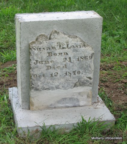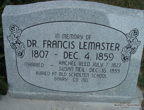 Inscription: "Married Rachel Reed July 7, 1827, Susan (Runyon) Neill Dec. 16, 1855, buried at Old Scholten School, Barry Co., MO" - Research Note: This is "In Memory of Stone" and the grandfather of Finis Morticai Lemaster. Francis was the son of John Lemaster and Frances Tackett. 1860 Barry Co., MO Mortality Schedule says he hung himself. Francis Lemaster married Susan Neill on Dec. 16, 1855 in Barry co., MO. Susan is buried at Osa Cemetery under Neill. - Susan's Obit - Cassville Republican, December 23, 1897 - Died, Dec. 11, Susan Duckworth, age 78. She was born in McMinn Co., TN, and she married Peter Neil in 1835. They moved to Crane Creek Twp., in Barry Co., in 1850. He died Oct. 15, 1851. They had 8 children. In 1855 she married Dr. Lemaster and had 2 sons Allen and Abraham. He died in 1859. In 1863 she married Thomas Duckworth who died in 1885. She then lived with her youngest daughter who is Mrs. A. M. Wiley. Grandma Duckworth has a daughter, Mrs. Enoch Williams, who is 58. Mrs. Williams has a daughter who is Mrs. Tom Bassett who is 40. She has a daughter who is Mrs. Frank Wise who is 18. She has a daughter who is 1 year old. | MO Mortality Schedule MO Marriage Records Phyllis Long Photo Stefanie Forester |