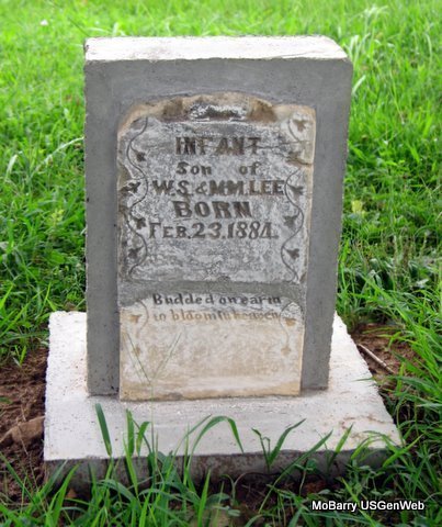 | LEE, Infant | Feb. 23, 1884 | No Date | Inscription: "Infant son of W. S. and M. M. Lee. Budded on earth to bloom in heaven." - Research Note: Stone was repaired and reset July 2008. | Photo Jack Fly |