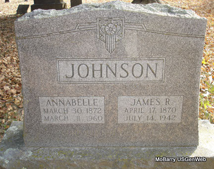 SSW: James Richard Johnson - Research Note: Annabelle died at the home of her son. Her husband was James L. Johnson and she was a daughter of James Teague and Margaret Gouge. Johnnie Johnson of Ellsinore, MO, was the informant on the death certificate. Grave #372. | Death Certificate Phyllis Long Photo Stefanie Forester |