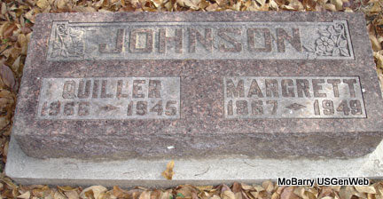 SSW: Quiller Johnson - Research Note: She was the wife of Quiller Aquilar Johnson and the daughter of James Teague and Margaret Jones. Elizabeth Teague married Quiller Johnson on Dec. 13, 1883 in Barry Co., MO. W. R. Johnson, father of Quiller, gave consent. Grave #385. | Death Certificate MO Marriage Records Phyllis Long Photo Stefanie Forester |