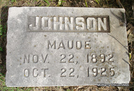 Research Note: Maude was the wife of Wright Eliza Smallie Johnson. Daughter of Simon Keller and Kate Marvin. King Funeral Home Records read that she was born Nov. 22, 1891 and that "Mrs." Johnson died of carcinoma of breast. Daughter of S. Keller of IL and Kate Marvin of IL born Nov. 22, 1891 in IN and died Oct. 21, 1925, dates are not the same as on the stone. Informant: W. E. Johnson, her husband, of Osa, MO. Her husband, Wright, is buried at Willamette National Cemetery in Happy Valley, Clackamas Co., OR. He was the son of Henry Stevens Johnson and Cassie Lewis. Marriage record transcribed as Maude Wilkin. Almost impossible to read so could be transcribed wrong. All researchers agree that her maiden name was Keller. Maude Wilkin married Wright E. Johnson in 1920 in Wright Co., MO. Simon Keller married Kate Marvin on May 17, 1888 in Clark Co., IL. Grave #123. | Death Certificate Donna Cooper King Funeral Home Jay Trace MO Marriage Records IL Marriage Index Census Phyllis Long Photo Death Certificate Stefanie Forester |