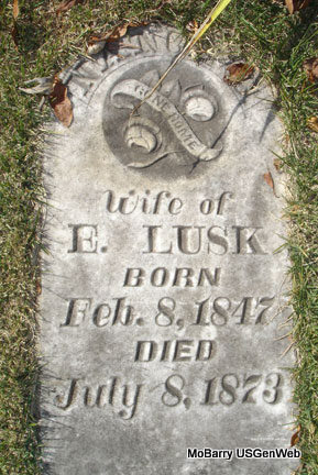 Inscription: "Wife of E. Lusk, Gone Home" - Research Note: This stone was repaired September 2008. - 1870 Census, Missouri, Lawrence Co., Buck Prairie - Nancy C. Lusk age 22 is the wife of Epaminondas Lusk age 26, with children Thomas age 3 and Porter age 1. - After Nancy died, Epaminondas married Mary Anveline Wilson on Oct. 1, 1874 in Barry Co., MO and was in TX in the 1900 Census. He died in 1910 is buried at Sanger Cemetery, Sanger, Denton Co., TX. Grave #262. | Census MO Marriage Records Phyllis Long Photo Jack Fly |