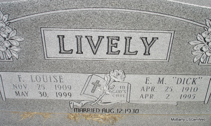 SSW: Earnest Mark "Dick" Lively - Inscription: "Married Aug. 12, 1930, In God's Care" - Research Note: Frances Louise McCoy Lively, age 89, of Marionville, died May 30, 1999, at St. John's Regional Health Center in Springfield. She was the daughter of Lloyd McCoy and Cora Wise. | Photo Stefanie Forester Monett Times Donna Cooper |