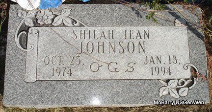 | JOHNSON, Shilah Jean | Oct. 25, 1974 | Jan. 18, 1994 | Research Note: There are initials "O G S" in the center of the stone. | Photo Stefanie Forester |