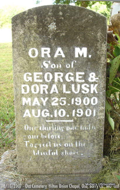 | LUSK, Ora M. | May 25, 1900 | Aug. 10, 1901 | Inscription: "Son of George and Dora Lusk - Our darling one hath gone before, To guide us on the blissful shore." | Photo Stefanie Forester |