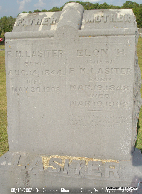 SSW: Elon H. Lasiter - Research Note: Civil War Veteran: Pvt., Co. F, 14 Reg., MO State Militia, Cavalry. He filed for his pension on Feb. 8, 1890 and his second wife filed on June 3, 1924. Son of Alexander Lasiter and Isabelle Higgenbotham. Francis Lasiter married Ellen/Elon H. Lee on Sept. 16, 1866 in Stone Co., MO. He second married Nancy S. (Varner) (Daughtery) (Periman) (Lasiter) (Baker) Gurley, buried at Washburn Prairie Cemetery. - Cassville Democrat, May 23, 1908 - Francis Marion Lassiter Dead: Life departed from Francis Marion Lassiter at his home 4 miles south of Cassville, Wednesday, May 20, 1908, of Bright's disease, age 63 years. He was born in Tennessee, and came to Missouri with his parents, when a small child, his father locating at Jolly; later they moved to Barry County, near Osa. He married but a few years back, his wife died and he again married. He is survived by his last wife, and a daughter, Mrs. Peco Houston of near Marionville, who attended her father several days before his death. He resided many years in the Osa neighborhood and from there moved to his last home. He was an old soldier of the war of the sixties, and a member of the Church of God. His remains were conveyed Thursday, to the Wise Cemetery near Osa, and there laid to rest, beside loved ones, gone before. Rev. Williams conducted funeral services at the grave. - Grave #32. | Online Obit Census Civil War Records Phyllis Long Photo Stefanie Forester |