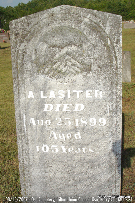 Inscription: "105 Years" - Research Note: Information from daughter Elizabeth Lasiter Wise's death certificate states that she was the daughter of Alexander Lasiter and Isabelle Higinbotham both born in NC, buried at Osa Cemetery. William Lasiter, son, buried at Hilton Cemetery gives his parents as Jotham Alexander Lasiter and Isabell Higgenbotham. Researchers say he was the son of Jotham Lasiter and Martha "Patsy" Johnson. Grave #29. | Note MO Marriage Records Phyllis Long Photo Stefanie Forester |