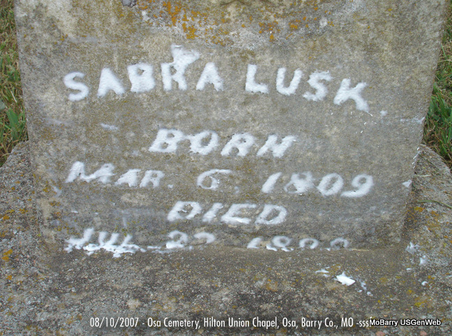 Inscription: "Husband of Sabra - Aged 81 Ys 8 Ms 27 Ds" - Research Note: Researchers say he was the son of Samuel Lusk born NC and Elizabeth Scott. - 1850 Census, District 5, Barry Co., Missouri - Thomas Lusk age 48 born TN, wife Sabra age 42, with children, Martha age 15, Elizabeth age 12, Epaminondas age 9, Xenophan age 7, and James M. age 3. Grave #318. | Note Census Phyllis Long Photo Stefanie Forester |