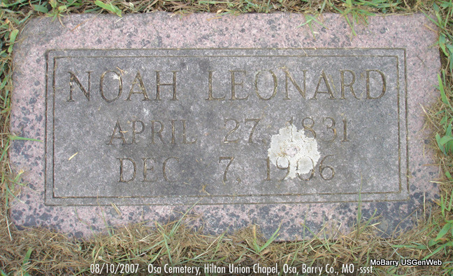 Dec. 7, 1906 | Research Note: His wife was Louisa Ann Coulter. She died 1923 buried at Wise Hill Cemetery, Clever, Christian Co., MO. Son of Abraham Leonard and Lucretia Harrison. Grave #310. | Census Phyllis Long Photo Stefanie Forester |