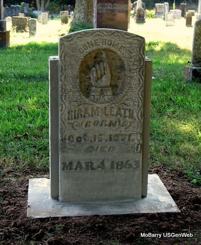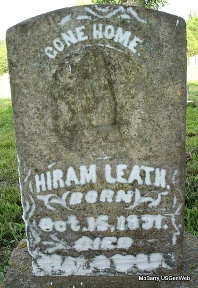 Inscription: "Gone Home" - Research Note: Stefanie posted that Hiram was born Oct. 12th - the stone reads Oct. 15th. This is a stone that was found broken in the Osa Cemetery in July 2010. Most likely not a victim of vandalism but may have been accidentally damaged as the stone was weak at the point of the break. Jack Fly cleaned and repaired it and then it was reset in August 2010. Hiram Leath married Martha Ann Anderson on Oct. 22, 1852 in Stone Co., MO. Hiram Leath fought as a private on the Union side of the American Civil War with Captain Moore's (Indpt.) Co., Stone County Regiment, Missouri Home Guard. - 1860 Crane Creek Twp., Barry Co., MO - Hyram Leath, 29, Blacksmith, Tennessee, Male; Martha A. Leath, 23, Domestic, Missouri, Female; Ibby J. Leath, 6, Missouri, Female; Mary E. Leath, 4, Missouri, Female; Sarah A. Leath, 2, Missouri, Female; David Leath, 9 months, Missouri, Male. - Grave #402. - Another Photo | MO Marriage Records Phyllis Long Photo Stefanie Forester Photo Jack Fly |