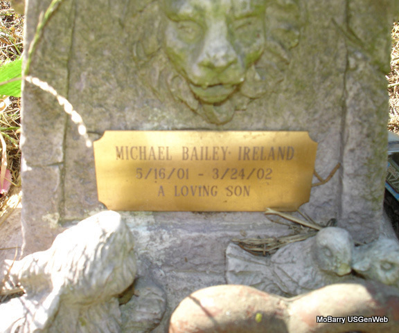 Inscription: "A loving son" - Research Note: Michael Bailey Ireland, infant son of Michael E. and Emily (Friend) Ireland of Aurora, died March 24 at the home. He was born May 16, 2001, in Marshall. Services will be 10:30 a.m. tomorrow, March 27, at Crafton-Cantrell Chapel in Aurora with Rev. Rick Robson officiating. Burial will be in Osa Cemetery south of Aurora under the direction of Crafton-Cantrell Funeral Home of Aurora. | Photo Stefanie Forester Monett Times Mar. 26, 2002 Donna Cooper |