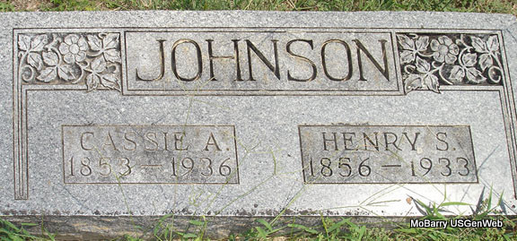 SSW: Cassie Johnson - Research Note: His wife was Cassie Lewis and he was the son of William R. Johnson and Susan Parks both born TN. W. E. Johnson of Aurora, MO was the informant on the death certificate. - August 11, 1917, Saturday, Cassville Democrat - H. S. Johnson, a prominent farmer of near Osa, motored to this city Monday. He said his father Wm. Johnson, age 86 years, was very feeble from an attack of paralysis. His many acquaintances in this city will regret to hear of his condition. - Grave #119 | King Funeral Home Jay Trace Death Certificate Online Newspapers Phyllis Long Photo Stefanie Forester |
