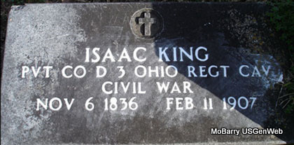 Inscription: "PVT CO D 3rd Ohio Regt Cav. - Civil War" - Research Note: A farmer, died of pneumonia at age 70 years, 3 months, 5 days. His first wife was Mary McBride, married on Dec. 19, 1867 in Montgomery Co., IL. He second married Sophronia Waie (Whitten) Clark. He was the son of Isham King and Ann Sanders. - Application for Military Headstones: Civil War Veteran, enlisted on Aug. 27, 1862 and discharged June 17, 1865. He was a private in Co. D, 3rd Ohio Regiment Cavalry. Mrs. Lula Logan of Crane, MO made the application on May 1, 1953. J. W. Logan made arrangements to pick it up. - Cassville Democrat, May 25, 1907 - Probate Court Proceedings: Estate of Isaac King, dec'd, clerks refused to grant letters of Administration approved. - Cassville Democrat, May 25, 1907 - Probate Court Proceedings: Same in estates of Sophronia King, dec'd; in refusing letters. - Grave #66. | King Funeral Home Jay Trace Military Headstones Census Online Newspapers IL Marriage Index Phyllis Long Photo Stefanie Forester |