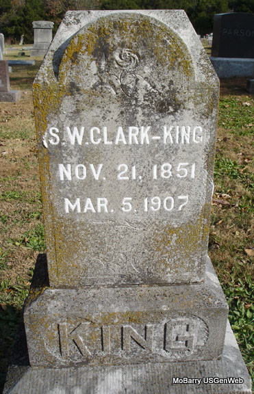 | KING, Sophronia Waie (WHITTEN) (CLARK) | Nov. 21, 1851 | Mar. 5, 1907 | Research Note: Her first husband was J. A. Vance Clark. She second married Isaac King. In fact her husband is buried up away from her in Osa Cemetery. If you notice on the deaths on Mr. King's stone he died February of 1907 and 3 weeks later Sophronia passed in March of 1907. The reason I know this is they were my G-G-Grandparents. One of their 3 daughters was Charity May who married Loren Oliver Grisham and one of their daughters was Alice Louella who married Floyd Albert Greenway and their daughter Lois Marie married Wayne Scott who are my parents. - She was the daughter of Jonathan Whitten and Mary Jane Scruggs. J. V. Clark married Sophronia Whitten on Sept. 12, 1877 in Smith Co., TN. Isaac King married Sophronia Clark on Oct. 27, 1889 in Stone Co., MO. - March 23, 1907, Saturday, Cassville Democrat - Hickory Grove News: Mrs. Isaac King is dead. - Cassville Democrat, May 25, 1907 - Probate Court Proceedings: Estate of Isaac King, dec'd, clerks refused to grant letters of Administration approved. - Cassville Democrat, May 25, 1907 - Probate Court Proceedings: Same in estates of Saironia/Sophronia King, dec'd; in refusing letters. - Grave #65. | Note Belynda Scott King Funeral Home Jay Trace MO Marriage Records TN Marriage Records Census Online Newspapers Phyllis Long Photo Stefanie Forester |