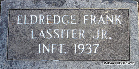 | LASSITER, Eldridge Frank, Jr. | July 8, 1937 | July 8, 1937 | Inscription: "Infant" - Research Note: Order to father E. F. Lassiter, born in MO. Mother Laura M. Marton, born in OK. Order by Puffy Hunt, paid by C. C. Hamilton. Stillborn. Grave #95. | King Funeral Home Jay Trace Photo Stefanie Forester |
