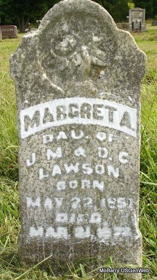 | LAWSON, Margaret A. | May 22, 1851 | Mar. 21, 1872 | Inscription: "Dau. of J. M. and D. C. Lawson" - Research Note: Margaret A. Lawson was the daughter of Jeremiah Lawson and Dicy C. (or S.) Ellis who were married Oct. 26, 1840 in McMinn Co, TN. In the 1870 census Jeremiah and Dicy with their children including Margaret A., age 18, were registered in the 3rd Civil District, Bradley Co., TN. In the 1880 Census Jeremiah and Dicy lived in Kings Prairie Township, Barry Co., MO. I am unable to find Margaret in the 1880 census, and it appears from the photograph that the date of death on the stone could read 1872. Further, I believe that the Mary Lawson in grave #447 is her grandmother. Grave #446. | Photo Stefanie Forester Census TN Marriage Records Jim L. Wilson |
