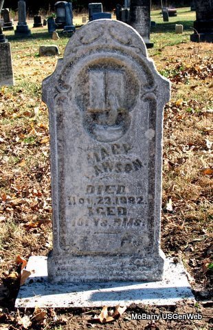 | LAWSON, Mary (CAMPBELL) | Abt. 1781 | Nov. 23, 1882 | Inscription: "Aged 101 yrs., 9 mos." Note: Mary Lawson was the mother of Matilda Lawson Ellis, (see Osa Cemetery grave #133). Her year of birth based on the ages shown for her in the various census records is calculated to be between 1785 and 1800. The age shown on her stone would make her birth date Feb. 23, 1781, earlier than any of these records. In the 1880 Federal Census she was residing in the home of James and Matilda Culton in Pierce Township, Stone Co., MO where she was listed as "mother", age 95 years and birth place Virginia. She was described as being "very feeble". I believe this is the same Mary Lawson found in the 1870 Federal Census living in the 3rd Civil District, Bradley Co., TN next door to Jeremiah and Dicy Lawson (see grave #446). In that census her age was given as 70 years and birthplace as Virginia. More research is needed before I can conclude that this is the same Mary Lawson found in the 1850 Federal Census with husband Richard in the 23rd subdivision, McMinn Co., TN, where her age is shown as 56 years and his as 60 years. Grave #447. | Photo Jack Fly Headstone Census Jim L. Wilson |