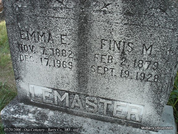SSW: Finis M. Lemaster - Research Note: Daughter of William Rufus Friend and Mary Elizabeth Tindall/Tyndall. F. M. Lemaster, age 23, married Emma Friend, age 19, on Oct. 9, 1902 in Barry Co., MO. She second married Claud Hemphill. Grave #574. Claude was the informant on the death certificate. | MO Marriage Records Census Death Certificate Phyllis Long Photo Stefanie Forester |
