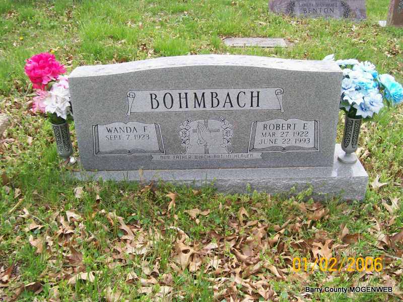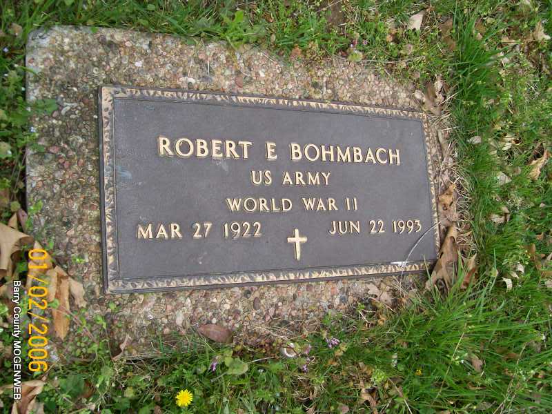 SSW: Wanda F. - Research Note: Son of Dietrick and Katherine (Bartels) Bohmbach. Married Wanda (Painter) Lambert on March 27, 1980 in Miami, OK. Robert was a veteran of World War II, having served in the U.S. Army and was a prisoner of war in Germany. He was a member of the Southwest Missouri Ex-Prisoners of War in Joplin. He was a member of the Shell Knob Memorial V.F.W. Post 2203. He moved to Shell Knob in 1946 after leaving the service and had been in the masonry business all of his life. - Military Stone - Inscription: "US Army, WW II" | Transcription Penny Cooper Bailey Obit Phyllis Long Photos Jay Trace |